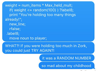 ReplyDeleteI was confused because I was looking at the actual original Zork I source code (with the original Imp labels) and they use the term/call FUMBLE for the can't-hold-everything code, as well as for a spell in Zork II. But also, I'm not a programmer and that original code is dense, super dense.